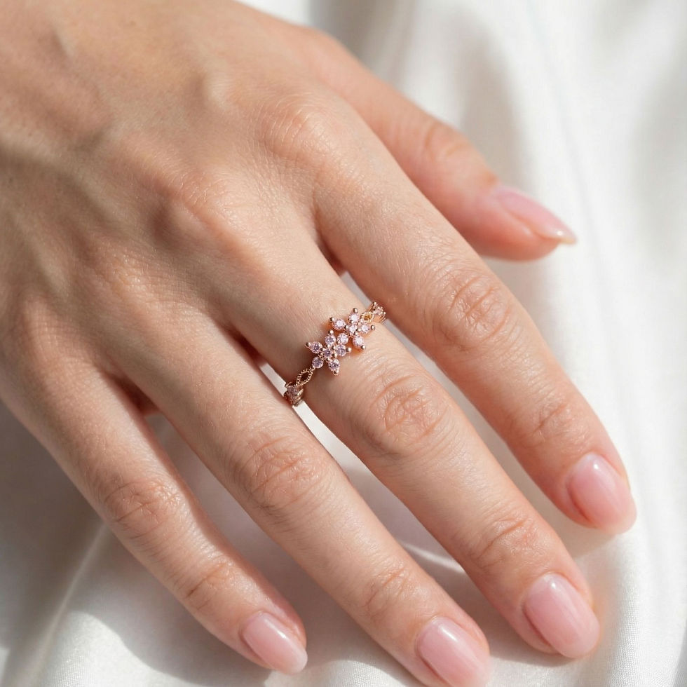 Dainty pastel rings with soft enamel and romantic details. Paired with pearl, crystal, and silver for a dreamy, feminine look.